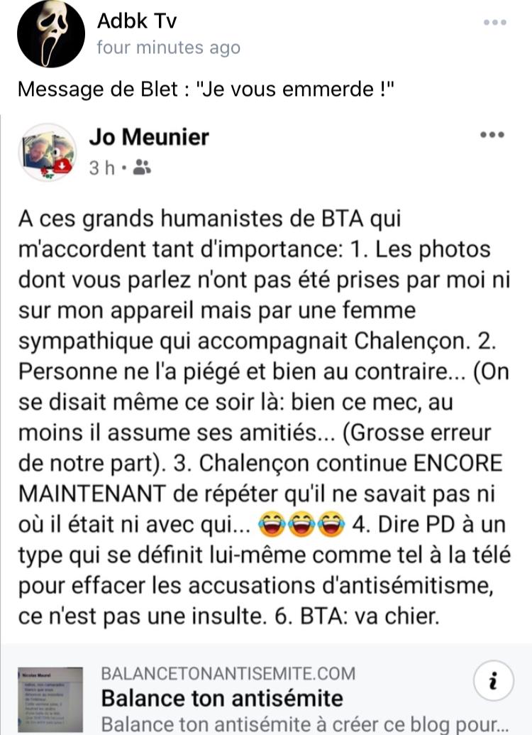 Le courageux et obscène Blet vient ramper et se justifier suite à la publication notre dernier article : https://www.balancetonantisemite.com/2020/10/pierre-jean-calencon-cible-de-la.html