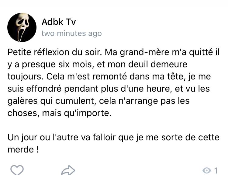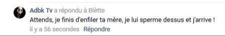 « Alors Adbk tu nous chiales un coup, qu’on rigole un peu !!! …. Toi qui incite à la haine post après post, là tu viens nous faire la pleurniche en nous parlant de Mamie Thérèse (1923-2020). MDR ! Tu n’étais même pas sur son testament à ce que l’on dit et ça … çà te les casse lol