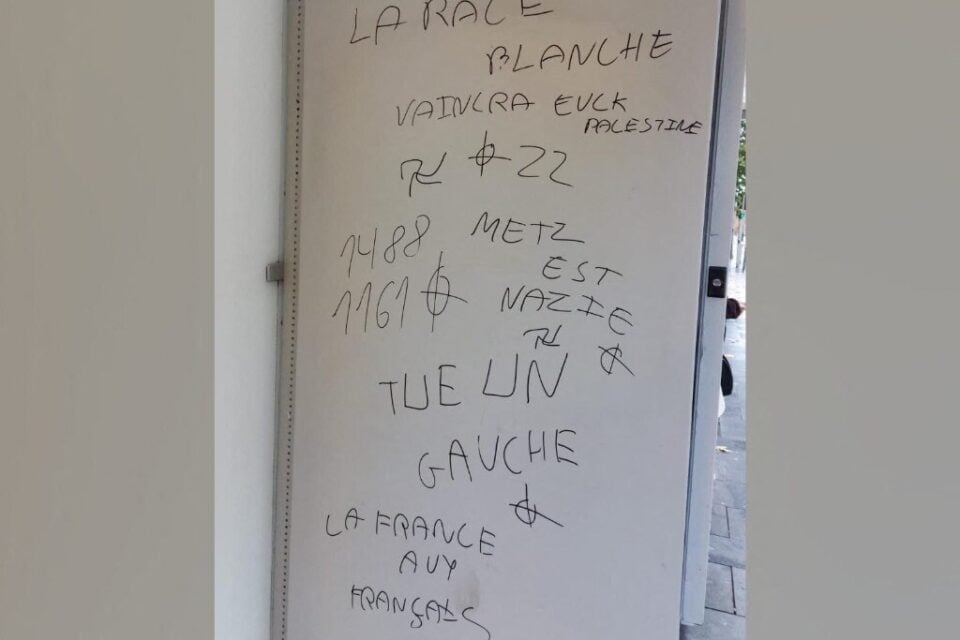 Des inscriptions haineuses et antisémites, dont « Tue un juif », « Tue un Palestinien » et « Metz est nazie », ont été découvertes près du campus universitaire du Saulcy et du lycée Fabert, à Metz (Moselle), a rapporté le site actu.fr.