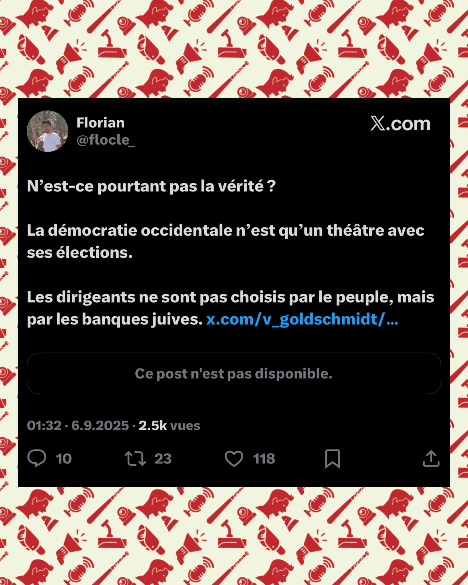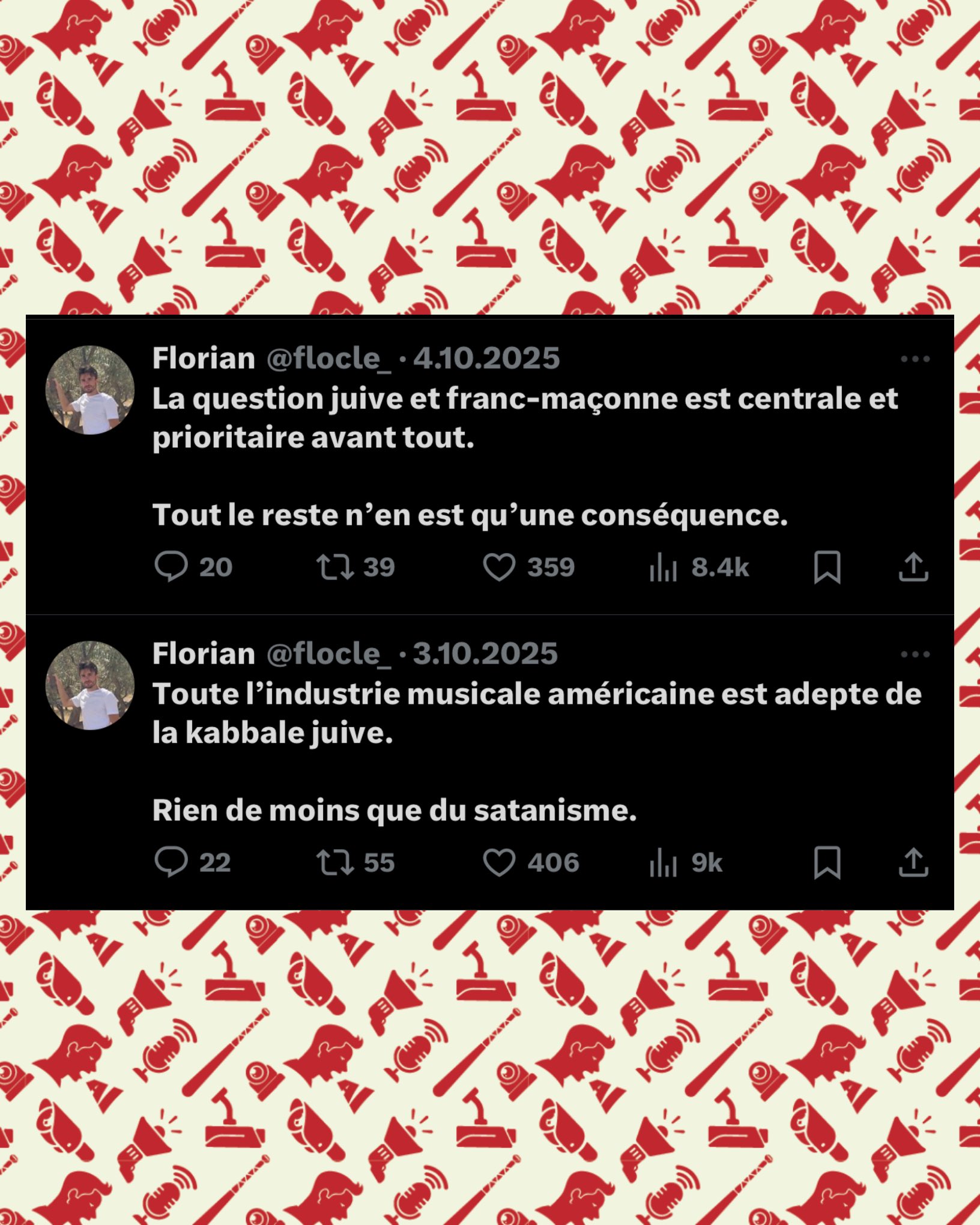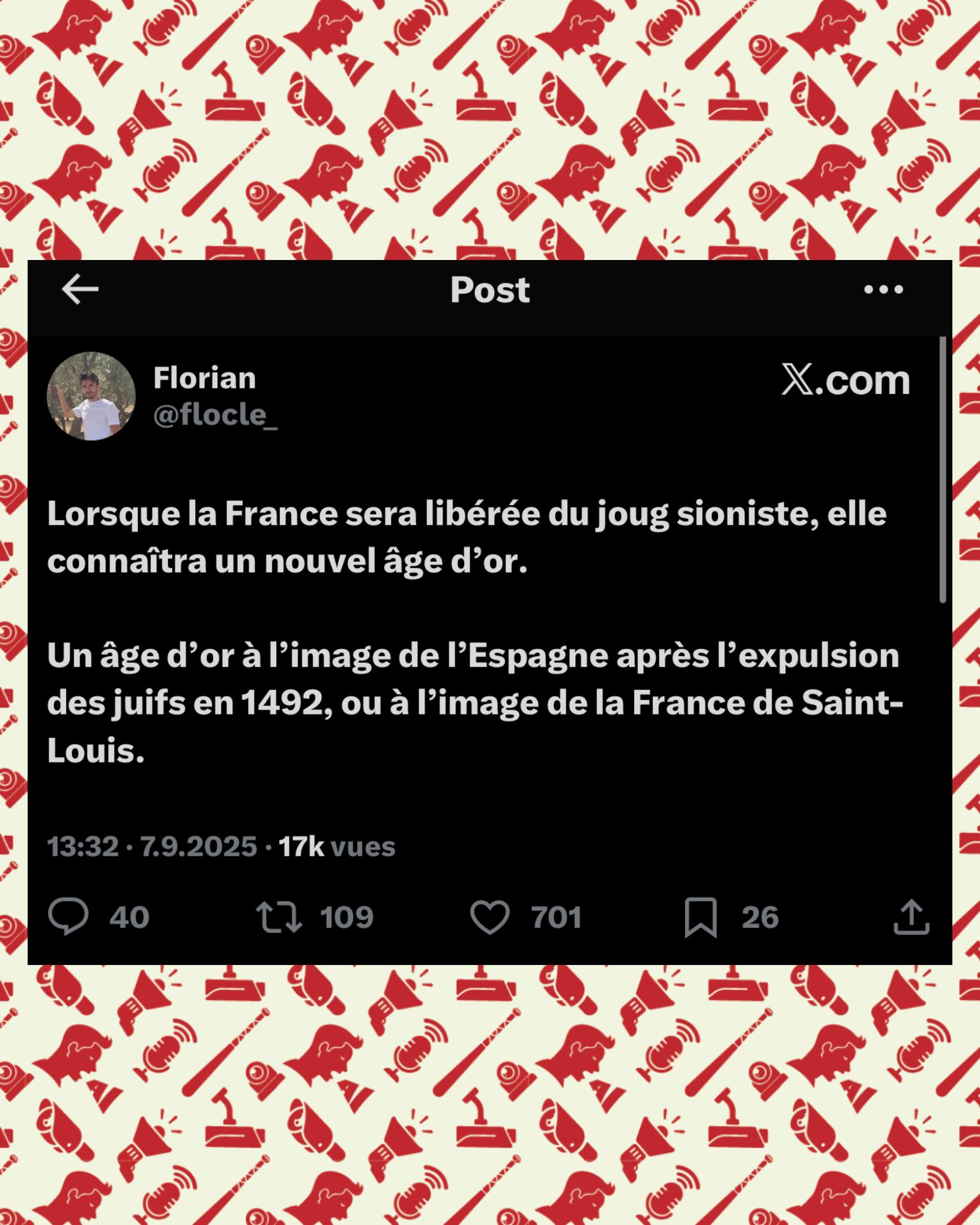 SwordOfSalomon SIGNALEMENT: Florian Guilleminot-Clément, royaliste de 24 ans, habitant à Montluçon (03), est l’un des comptes X les plus violemment antijuifs actuellement actifs.