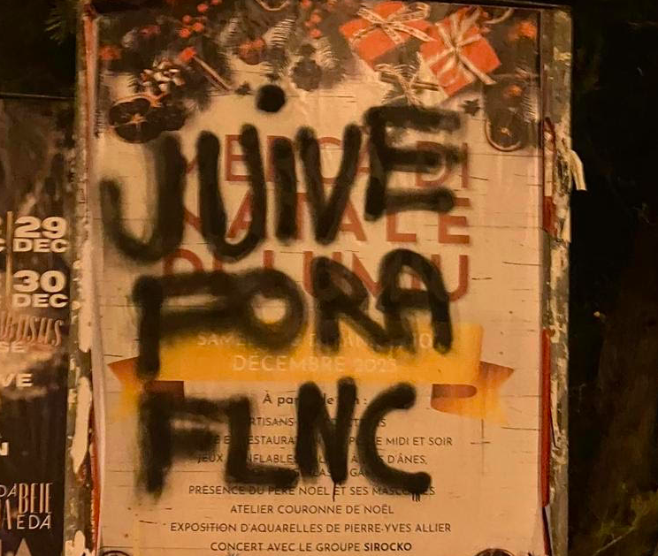 Dans la nuit du 1er au 2 janvier 2024, une série de tags insultants a fait son apparition aux abords du rond-point menant à l’aéroport de Calvi. L’inscription » Juive fora FLNC IFF » a notamment été bombée sur les trottoirs et panneaux de signalisation, dans un improbable mélange des genres. » Juive dehors », peut-on traduire, avant deux acronymes désignant le Front de libération nationale corse ou encore » I Francesi fora » pour » Les Français dehors « .