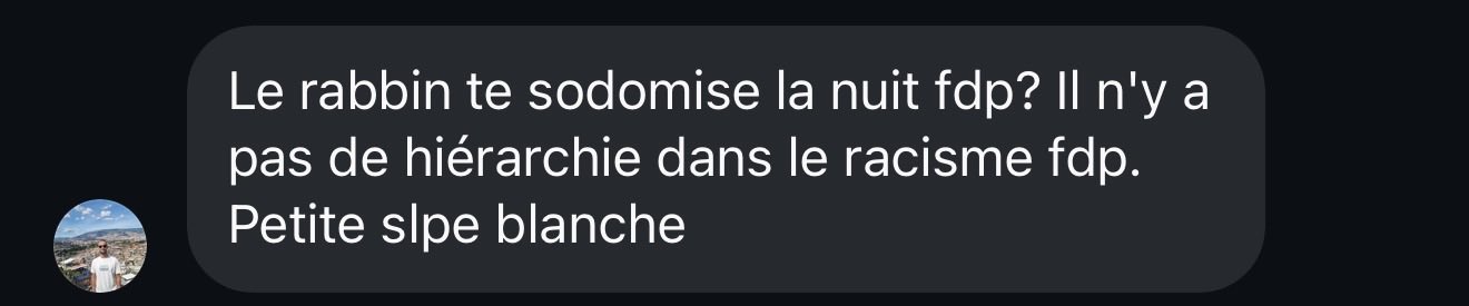 Une menace de mort émanant clairement de la meute, à la fois antisémite et raciste (le combo gagnant) reçu sur Insta. Comme ce personnage le dit très bien, tous les racismes se valent et lui n'est ni raciste ni antisémite 🤪 pic.twitter.com/yB3133jxQD