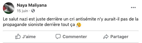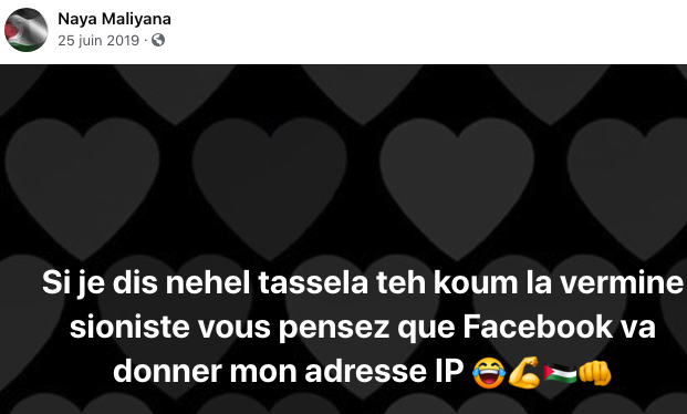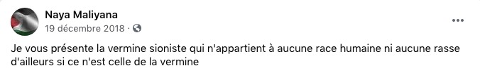 Cette activiste BDS n’en est pas à son premier coup d’éclat. Déjà sur Facebook, elle diffuse sa haine d’Israel et des juifs :