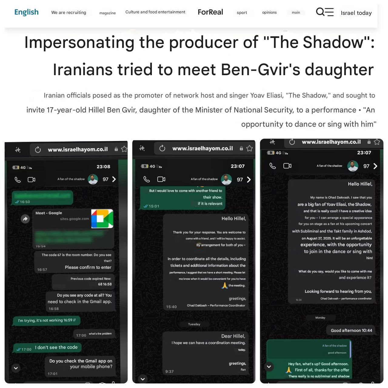 Révélations du quotidien israélien « Israel Hayom » : les services secrets iraniens ont essayé d’approcher Hillel Ben Gvir (17 ans), la fille du ministre Itamar Ben Gvir, en se faisant passer pour des producteurs du show-bizz et en lui proposant une collaboration avec un célèbre chanteur israélien. Tentative de kidnapping, d’assassinat ? L’opération a été déjouée par le Shin Beth, les services de sécurité intérieure israéliens.