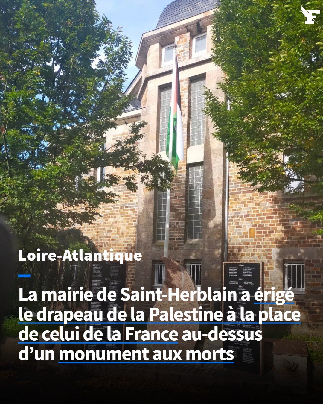 La commune de Saint-Herblain près de Nantes a remplacé le drapeau tricolore par un drapeau palestinien au-dessus du monument aux morts lors de la journée de reconnaissance de la Palestine. Une initiative de la mairie qui ne passe pas pour certains habitants.