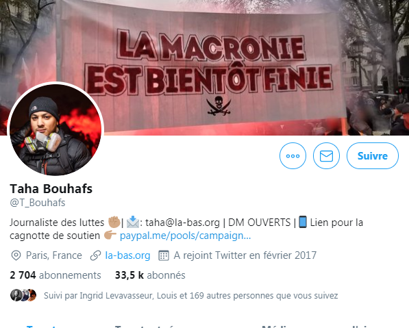 12. […] Le 17 janvier 2020, Taha Bouhafs signale via Twitter la présence d’Emmanuel Macron au théâtre des Bouffes du Nord dans le 10e arrondissement de Paris, où le président de la République assiste à une représentation.Quelques minutes plus tard, des dizaines d’activistes se rassemblent en une manifestation spontanée devant le théâtre et tentent d’en forcer l’entrée. Le président est exfiltré vers 22 heures.Taha Bouhafs est alors arrêté et placé en garde à vue pour « participation à un groupement formé en vue de commettre des violences ou des dégradations ».Comme le remarquent plusieurs médias, il n’est pourtant pas le premier à signaler la présence d’Emmanuel Macron sur les réseaux sociaux, même si son premier message s’accompagne de commentaires plus menaçants :« Je suis actuellement […] trois rangées derrière le président de la République. Des militants sont quelque part dans le coin et appellent tout le monde à rappliquer. Quelque chose se prépare… La soirée risque d’être mouvementée », écrit-il, avant de plaisanter en parlant d’Emmanuel Macron :« Je lui fais une George Bush avec ma Air Force One ? »,  probable référence au lancer de chaussures d’un journaliste irakien sur l’ex-président américain, en 2008.Plusieurs élus insoumis dont Alexis Corbière, Eric Coquerel et Clémentine Autain, ainsi que l’association Attac, lui ont exprimé leur solidarité et réclamé sa libération immédiate.Un rassemblement de soutien était prévu ce samedi midi.Taha Bouhafs est également accusé d’antisémitisme par ses détracteurs, notamment à cause d’un échange de tweets en février 2019 survenu après la prise à partie d’Alain Finkielkraut, traité de « sale sioniste », par des « gilets jaunes ».Alors que Benoît Hamon réagit en écrivant que « sale sioniste » est synonyme de « sale juif », Taha Bouhafs lui répond : « C’est bientôt le dîner du CRIF [Conseil représentatif des institutions juives de France, NDLR], et t’as pas envie d’être privé de petits fours. » Rapprochant les « petits fours » des fours crématoires des camps d’extermination nazis, la Licra (Ligue internationale contre le racisme et l’antisémitisme) réagit alors avec véhémence.Il a également régulièrement attaqué « Charlie Hebdo » et ses couvertures régulièrement blasphématoires, notamment dans ce tweet, effacé depuis : Il soutient le terroriste arabe Salah Hamouri: Taha Bouhafs, né le 29 avril 1997 à Aïn Beïda en Algérie, est un journaliste et un militant antiraciste franco-algérien.Il participe à différents mouvements protestataires à partir de 2016, notamment en tant que militant au sein du comité Adama. Il est un des déclencheurs de l’affaire Benalla — c’est lui qui filme la première vidéo publiée, place de la Contrescarpe à Paris — et un journaliste couvrant différents mouvements protestataires pour Là-bas si j’y suis.Taha Bouhafs est cependant accusé par ses contradicteurs d’être communautariste, d’être un « journaliste militant » et d’avoir tenu des propos antisémites.En février 2019, Taha Bouhafs est au centre d’une polémique, qui éclate sur Twitter.Après l’altercation d’Alain Finkielkraut lors d’une manifestation de Gilets jaunes, où l’homme de lettres est accusé d’être un « sale sioniste », l’homme politique Benoît Hamon tweete que « « sale sioniste » voulait dire « sale juif » », ce à quoi le jeune journaliste répond : « C’est bientôt le dîner du CRIF [Conseil représentatif des institutions juives de France], et t’as pas envie d’être privé de petits fours. » Le rapprochement entre « petits fours » et les fours crématoires des camps d’extermination nazis est fait par la Ligue internationale contre le racisme et l’antisémitisme, la Licra, qui accuse Bouhafs d’antisémitisme. Ce dernier se défend et accuse à son tour la Licra de l’avoir « jeté en pâture » à une campagne d’insultes racistes et de menaces de mort.  Selon Marianne, Taha Bouhafs s’illustre régulièrement par des propos agressifs envers les « Blancs » et une « ligne communautariste ». Un ancien militant de LFI ayant signé une tribune dans le même média le considère par ailleurs comme représentatif de la dérive « communautariste » du mouvement : selon lui, il n’hésite pas « à traiter de “collabeurs” les Français d’origine maghrébine ayant le tort de critiquer la religion musulmane » ou à partager des publications d’Al-kanz.org, lequel « revendique un islam rigoriste, contestant la laïcité ».https://www.liguedefensejuive.com/taha-bouhafs-le-melenchoniste-du-jour-qui-fait-de-lhumour-avec-les…https://resistancerepublicaine.com/2020/01/19/qui-est-taha-bouhafs-interpelle-suite-au-harcelement-de-macron-aux-bouffes-du-nord/ […]
