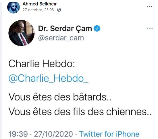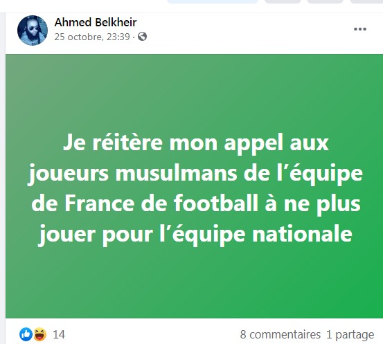 « Je m’adresse à Macron en tant que femme SOLDAT DE L’ISLAM …toi tu le regretteras amèrement…tu mérites qu’on te fait du mal ! Et nous allons te le faire ! .. des caricatures sur vous avez faites sur le prophète…et bien nous allons vous faire la guerre et j’assume . Je dis Macron tu n’est qu’un Bâtard ! Et je te déclenche une guerre Macron , je te le jure devant Dieu …c est moi qui te le dit SOLDAT DE L’ISLAM ! »